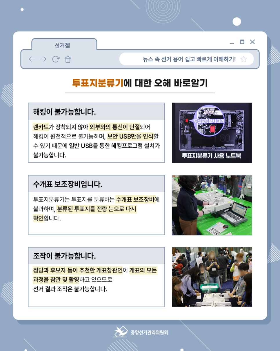 투표지분류기는 투표지를 분류하는 수개표 보조장비에 불과하며, 분류된 투표지를 전량 눈으로 다시 확인합니다.
