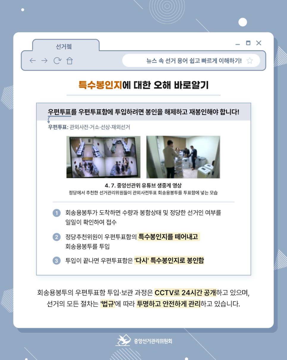 회송용봉투의 우편투표함 투입·보관 과정은 CCTV로 24시간 공개하고 있으며, 선거의 모든 절차는 '법규'에 따라 투명하고 안전하게 관리하고 있습니다.