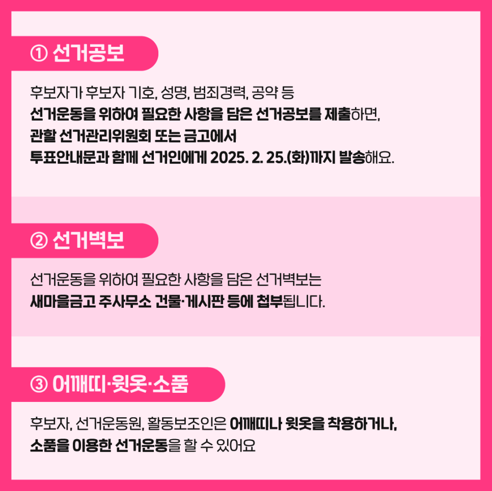 후보자가 후보자 기호, 성명, 범죄경력, 공약 등 선거운동을 위하여 필요한 사항을 담은 선거공보를 제출하면, 관할 선거관리위원회 또는 금고에서 투표안내문과 함께 선거인에게 2025. 2. 25.(화)까지 발송해요.