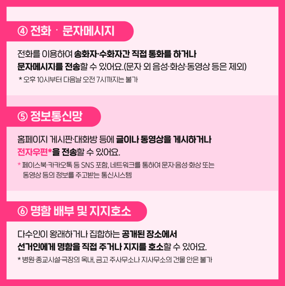 후보자는 다음과 같은 방법으로 선거운동이 가능합니다.