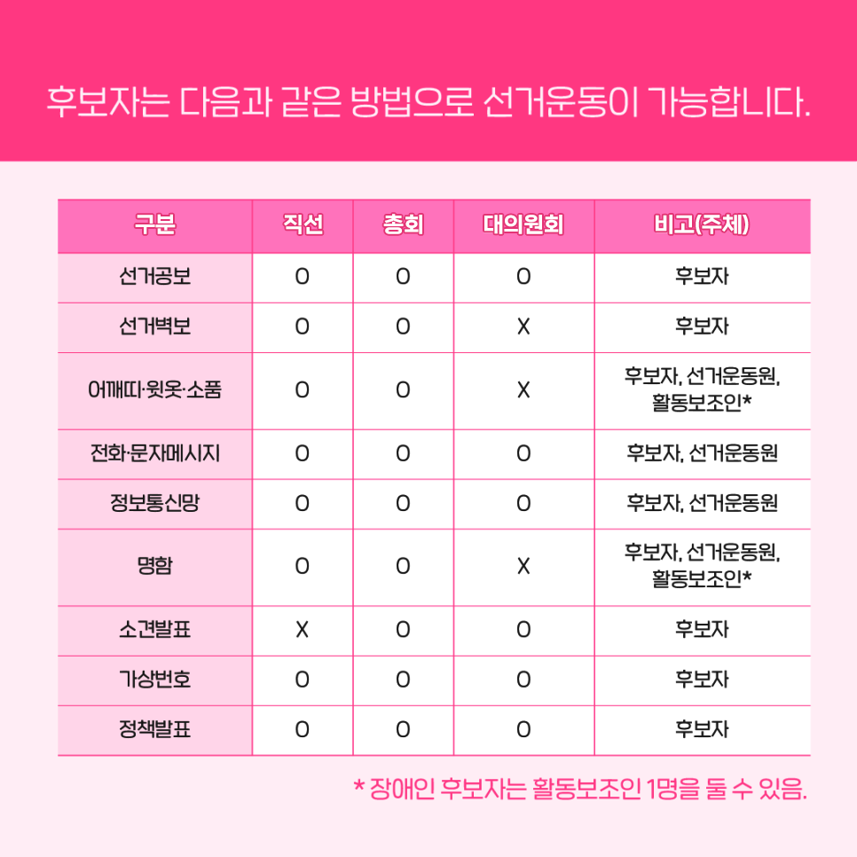 ※ 장애인 후보자는 활동보조인 1명을 둘 수 있음.
