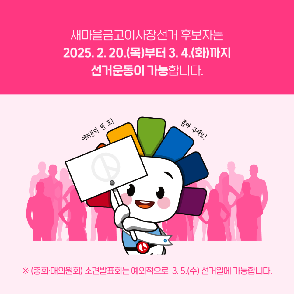 새마을금고이사장선거 후보자는 2025. 2. 20.(목)부터 3. 4.(화)까지 선거운동이 가능합니다.