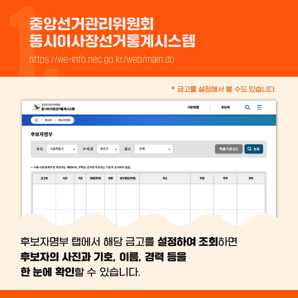 후보자명부 탭에서 해당 금고를 설정하여 조회하면 후보자의 사진과 기호, 이름, 경력 등을 한 눈에 확인할 수 있습니다.