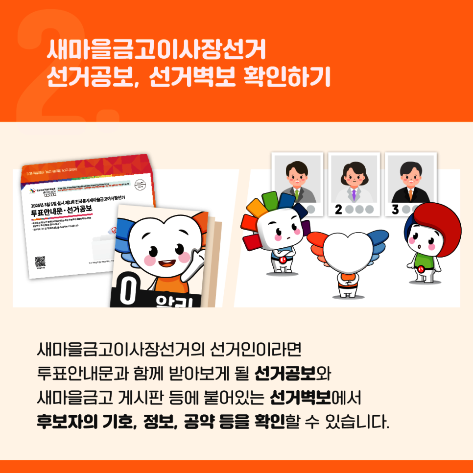 새마을금고이사장선거의 선거인이라면 투표안내문과 함께 받아보게 될 선거공보와 새마을금고 게시판 등에 붙어있는 선거벽보에서 후보자의 기호, 정보, 공약 등을 확인할 수 있습니다.