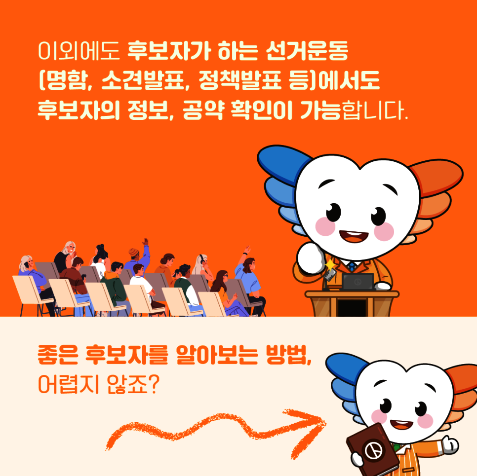 이외에도 후보자가 하는 선거운동(명함, 소견발표, 정책발표 등)에서도 후보자의 정보, 공약 확인이 가능합니다.