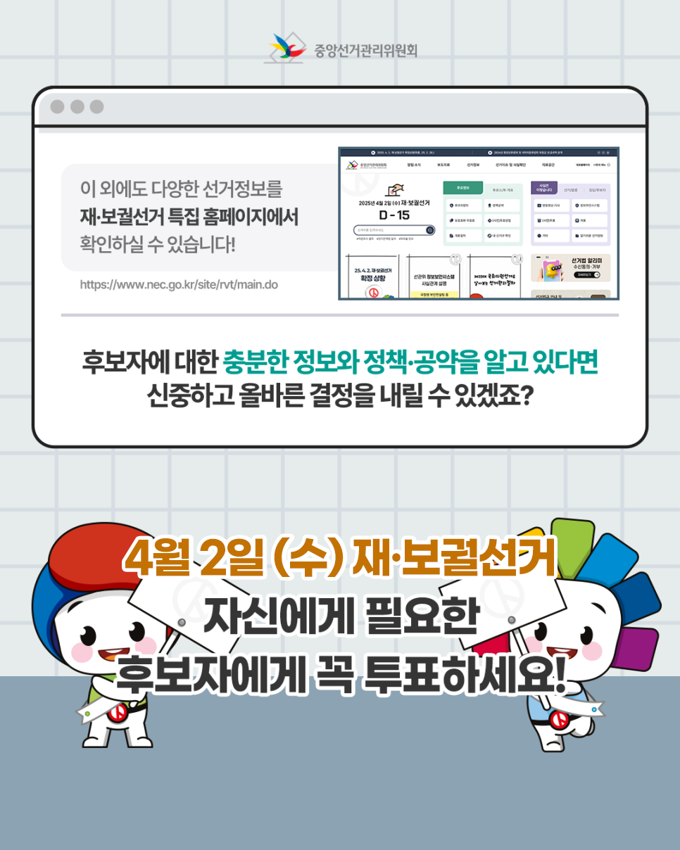이 외에도 다양한 선거정보를 재·보궐선거 특집 홈페이지에서 확인하실 수 있습니다!