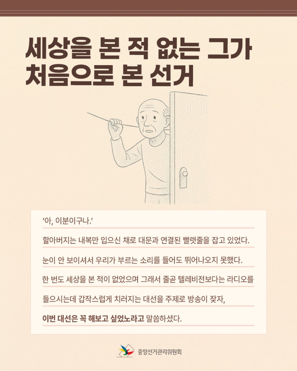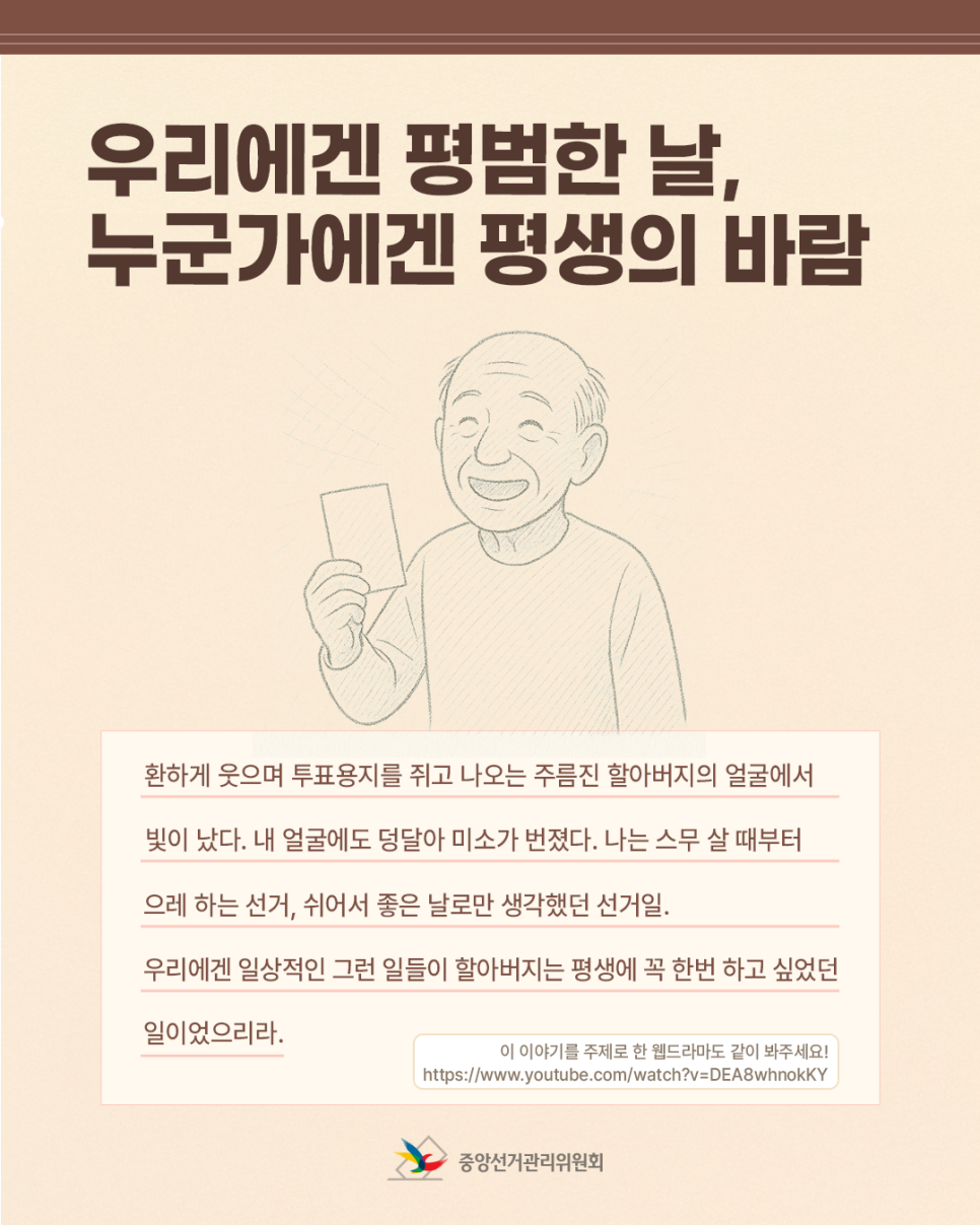 환하게 웃으며 투표용지를 쥐고 나오는 주름진 할아버지의 얼굴에서