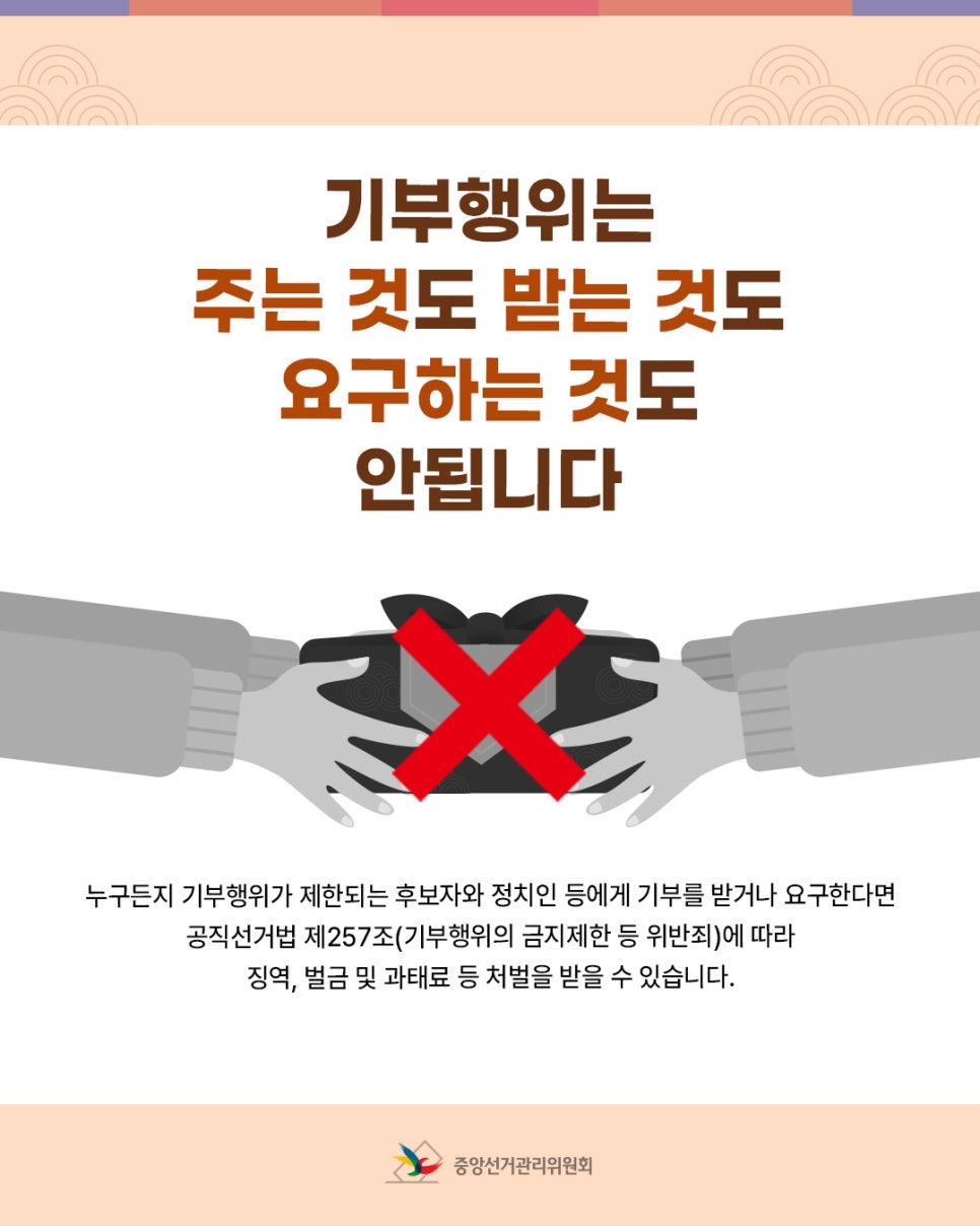 공직선거법은 정치인 · 후보자 등과의 선물 주고 받기 같은 기부행위를 상시 제한하고 있습니다.