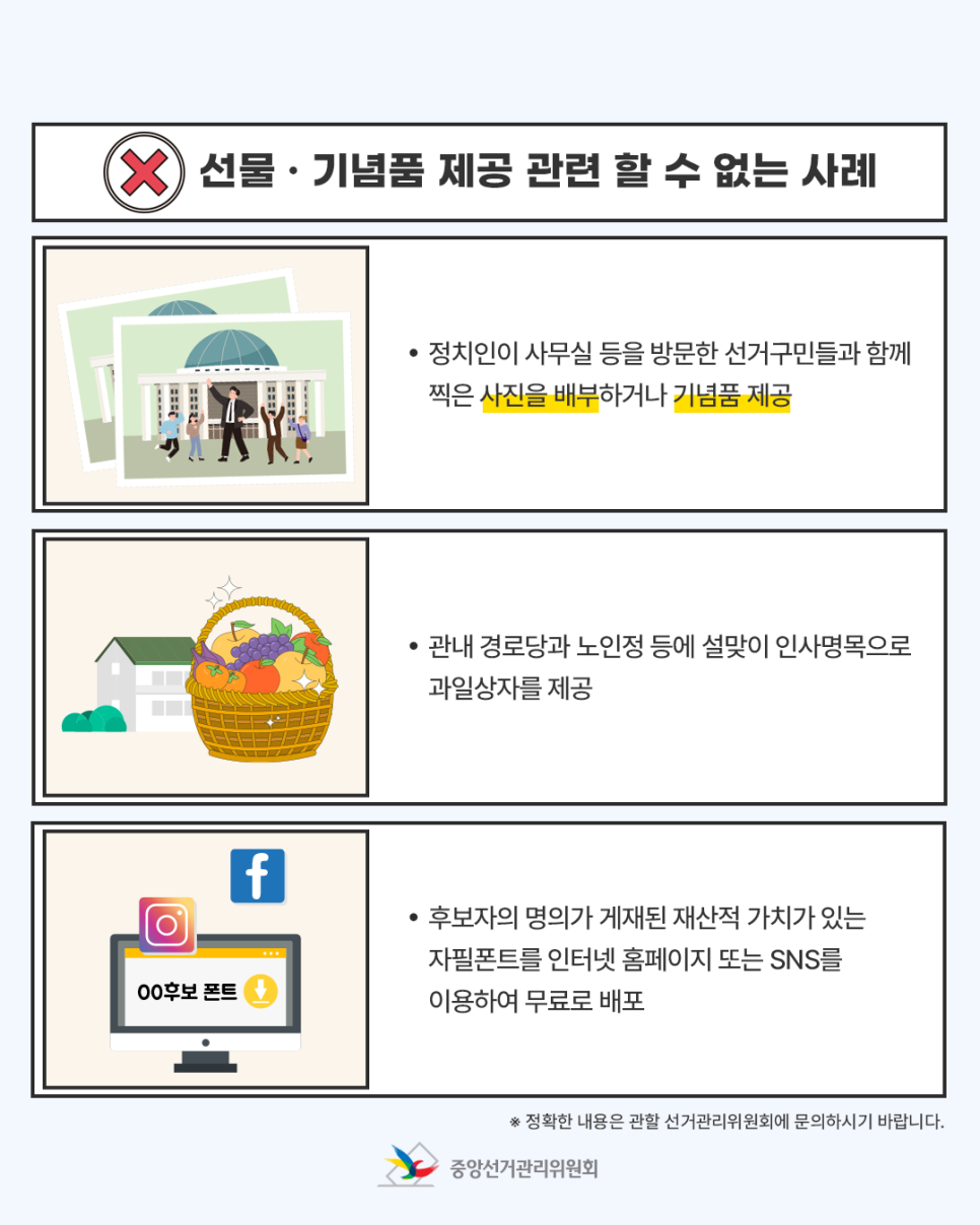 · 정치인이 사무실 등을 방문한 선거구민들과 함께 찍은 사진을 배부하거나 기념품 제공
