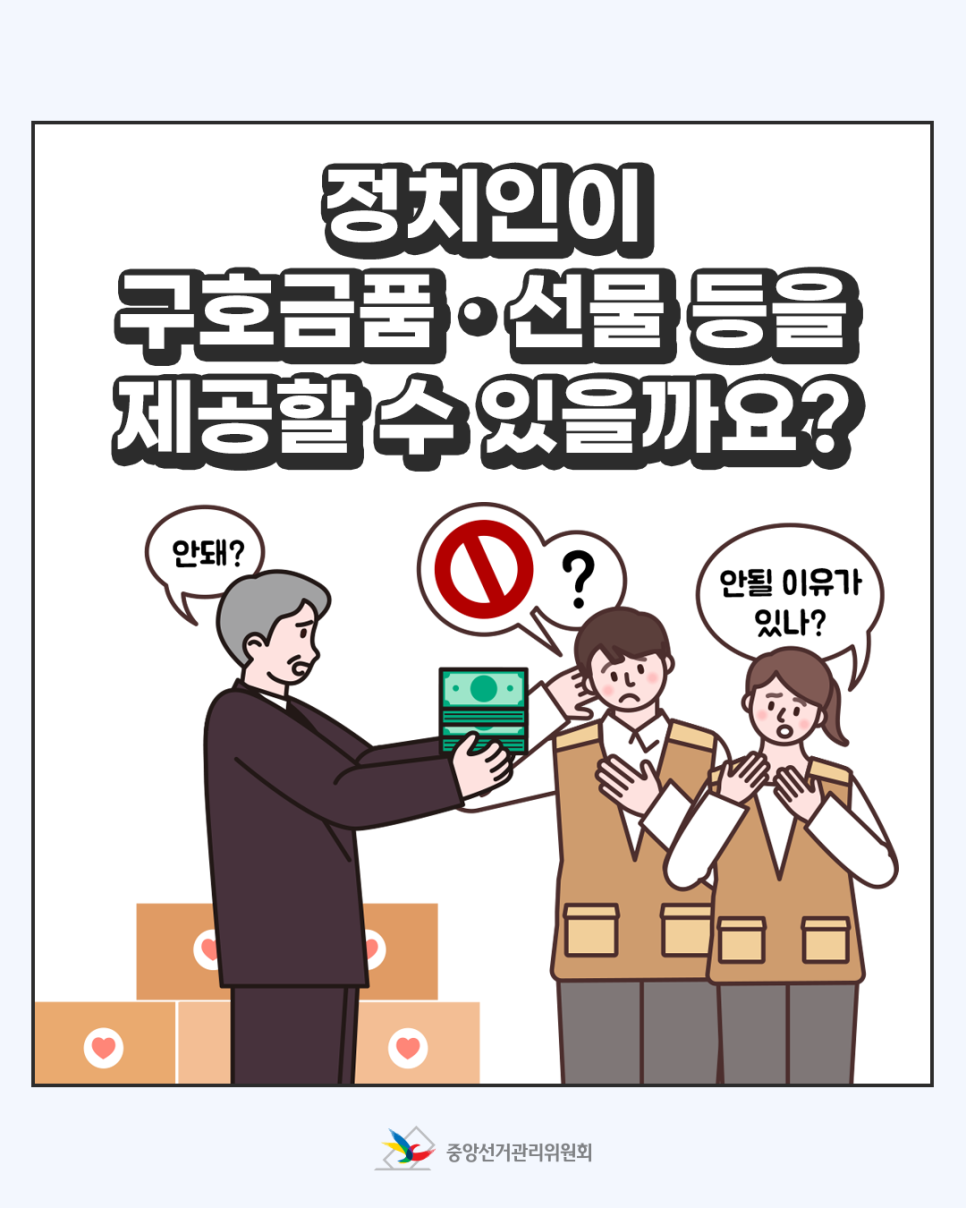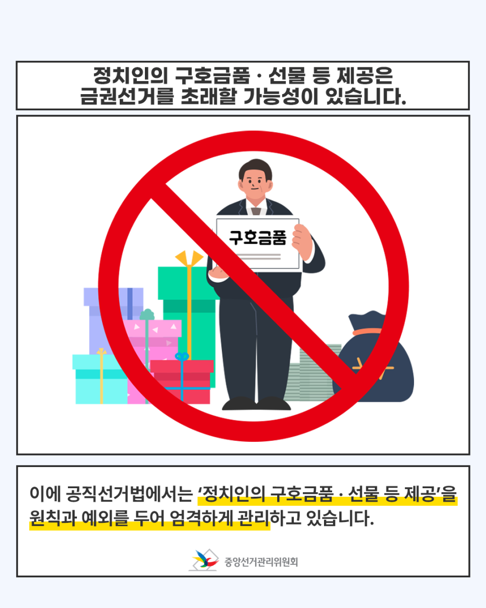 정치인의 구호금품 · 선물 등 제공은 금권선거를 초래할 가능성이 있습니다.