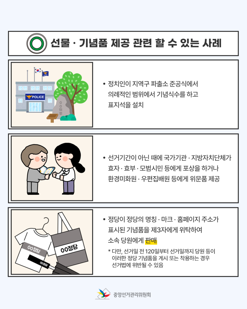 · 선거기간이 아닌 때에 국가기관 · 지방자치단체가 효자 · 효부 · 모범시민 등에게 포상을 하거나 환경미화원 · 우편집배원 등에게 위문품 제공