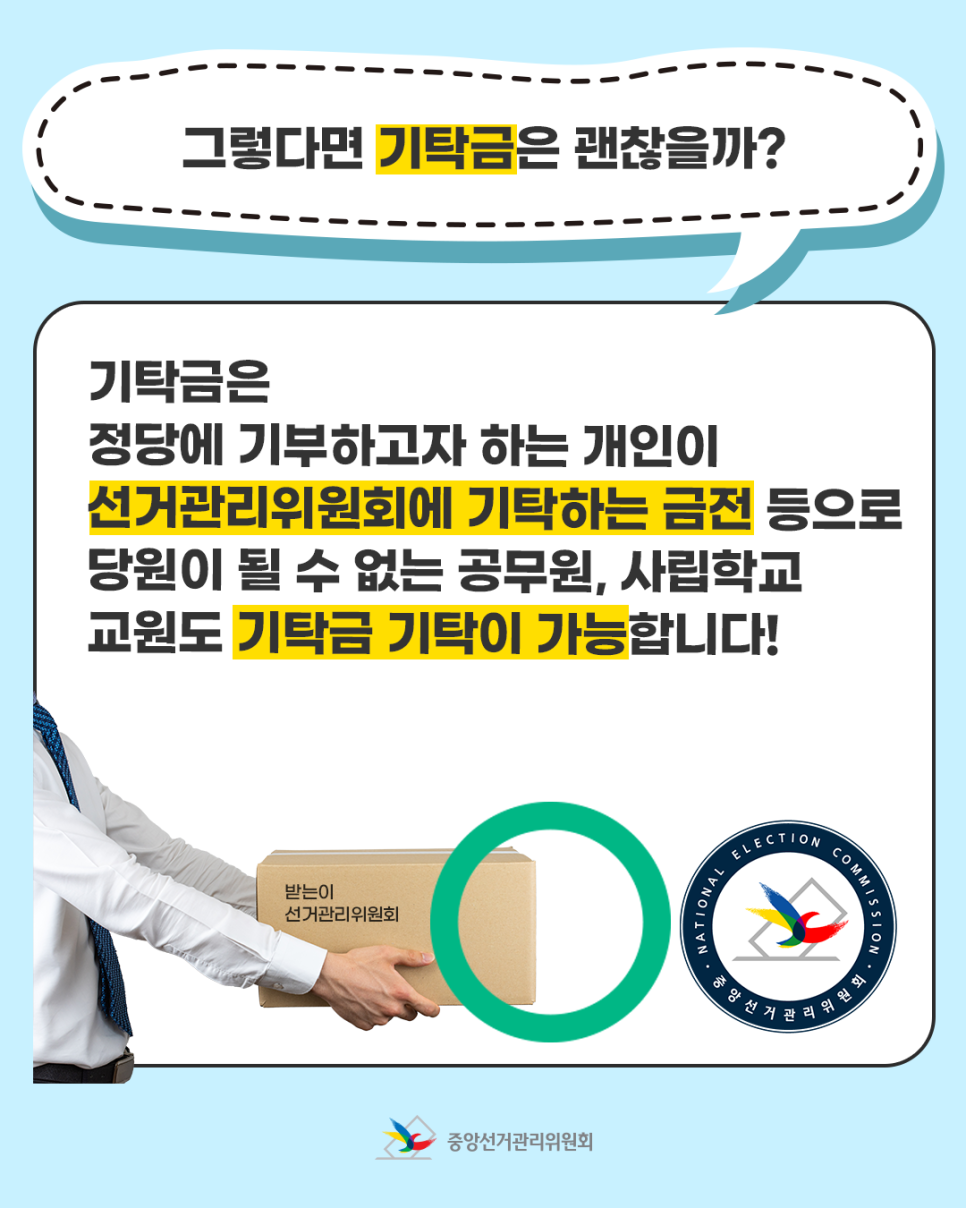 기탁금은 정당에 기부하고자 하는 개인이 선거관리위원회에 기탁하는 금전 등으로 당원이 될 수 없는 공무원, 사립학교 교원도 기탁금 기탁이 가능합니다!