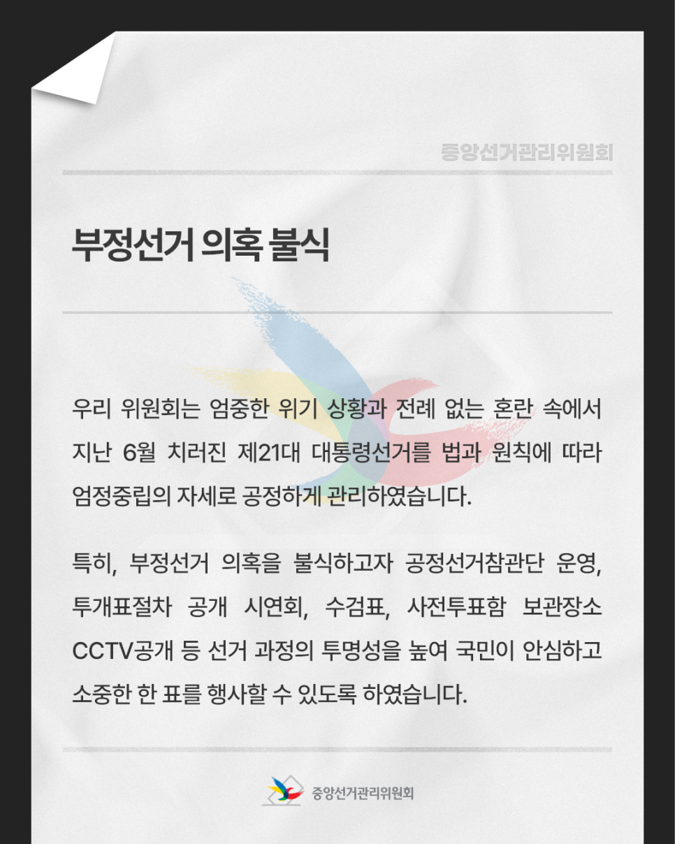 우리 위원회는 엄중한 위기 상황과 전례 없는 혼란 속에서 지난 6월 치러진 제21대 대통령선거를 법과 원칙에 따라 엄정중립의 자세로 공정하게 관리하였습니다.