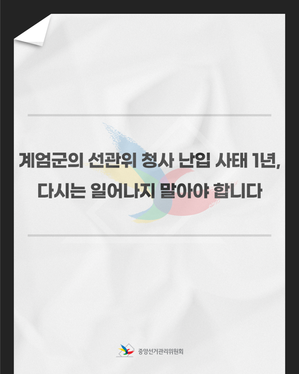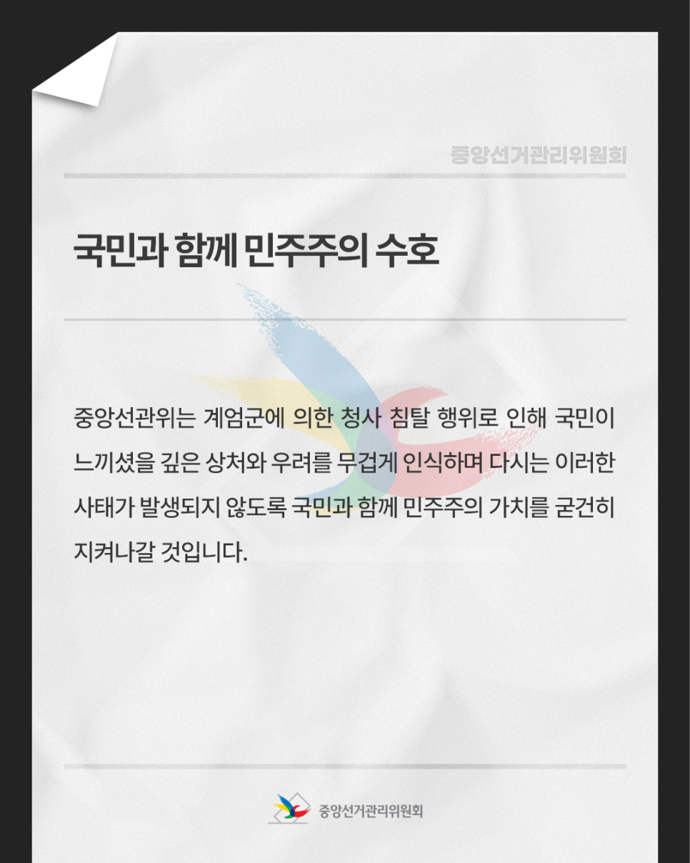중앙선관위는 계엄군에 의한 청사 침탈 행위로 인해 국민이 느끼셨을 깊은 상처와 우려를 무겁게 인식하며 다시는 이러한 사태가 발생되지 않도록 국민과 함께 민주주의 가치를 굳건히 지켜나갈 것입니다.