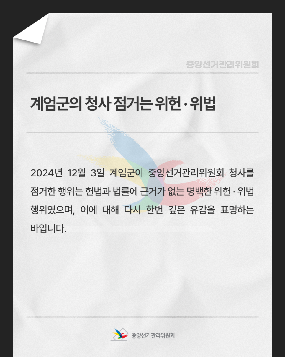 2024년 12월 3일 계엄군이 중앙선거관리위원회 청사를 점거한 행위는 헌법과 법률에 근거가 없는 명백한 위헌 · 위법 행위였으며, 이에 대해 다시 한번 깊은 유감을 표명하는 바입니다.