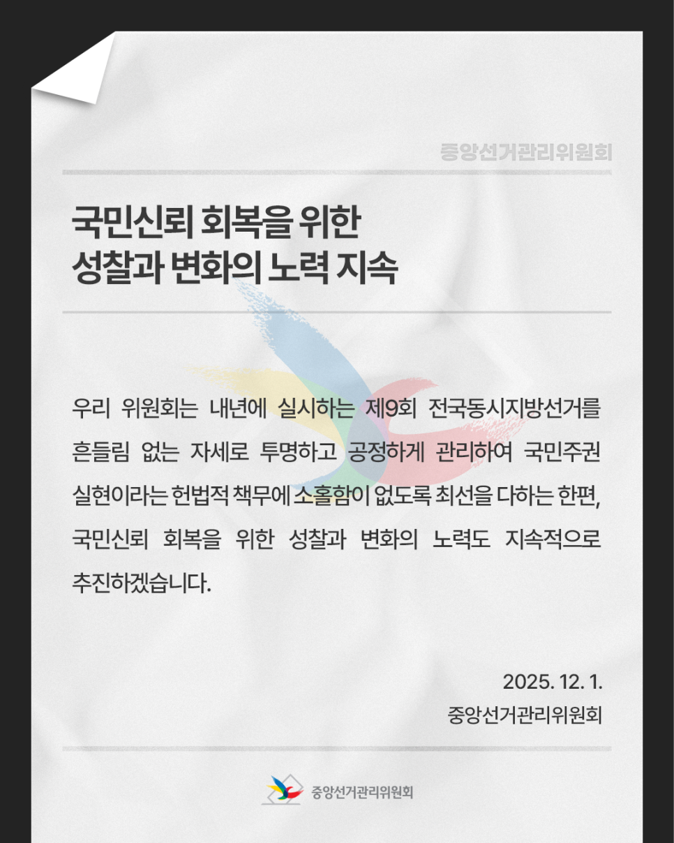 우리 위원회는 내년에 실시하는 제9회 전국동시지방선거를 흔들림 없는 자세로 투명하고 공정하게 관리하여 국민주권 실현이라는 헌법적 책무에 소홀함이 없도록 최선을 다하는 한편, 국민신뢰 회복을 위한 성찰과 변화의 노력도 지속적으로 추진하겠습니다.