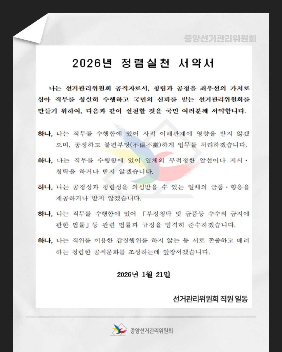 국민의 신뢰를 받는 선거관리위원회를 만들기 위하여, 다음과 같이 실천할 것을 국민 여러분께 서약합니다.