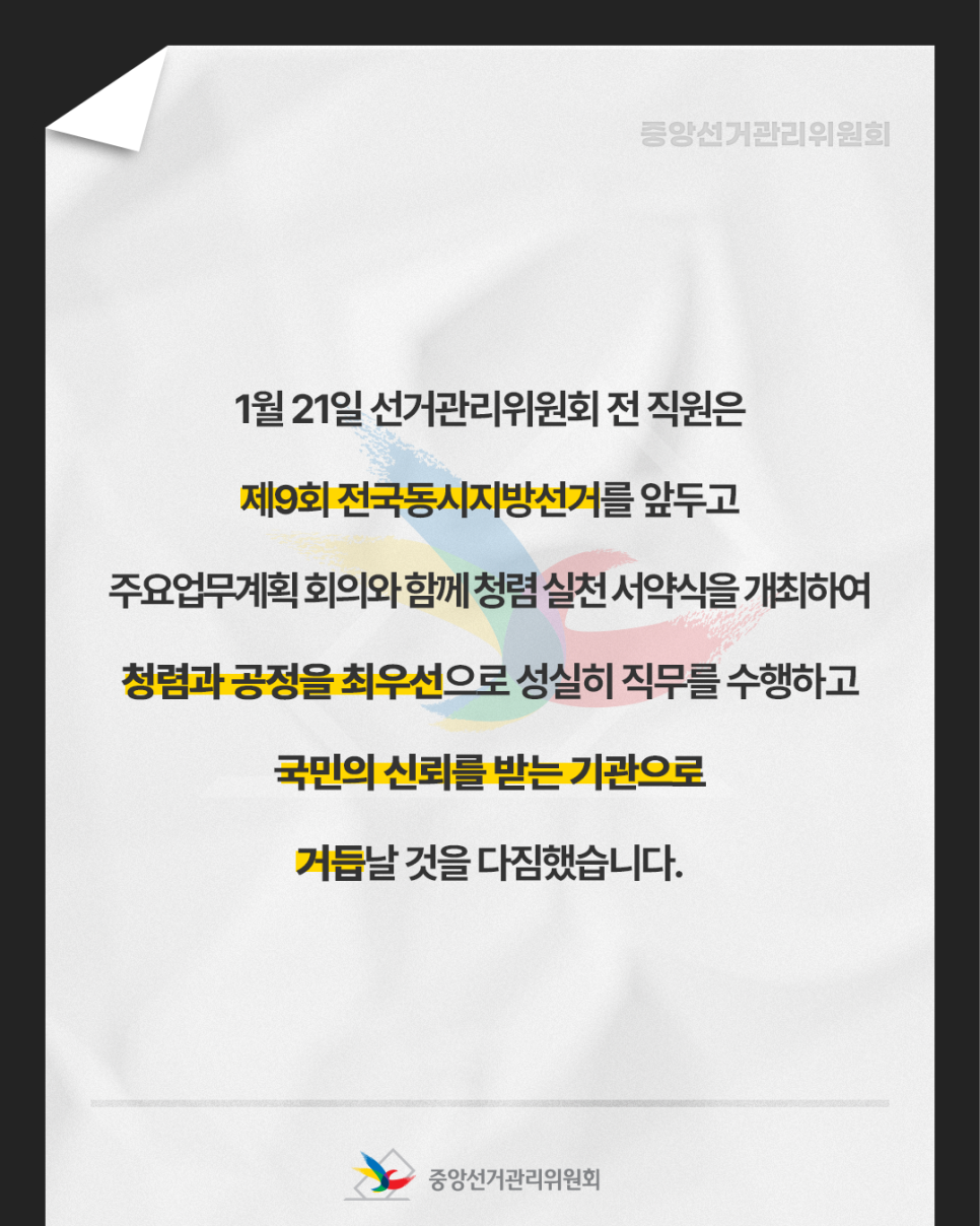1월 21일 선거관리위원회 전 직원은 제9회 전국동시지방선거를 앞두고