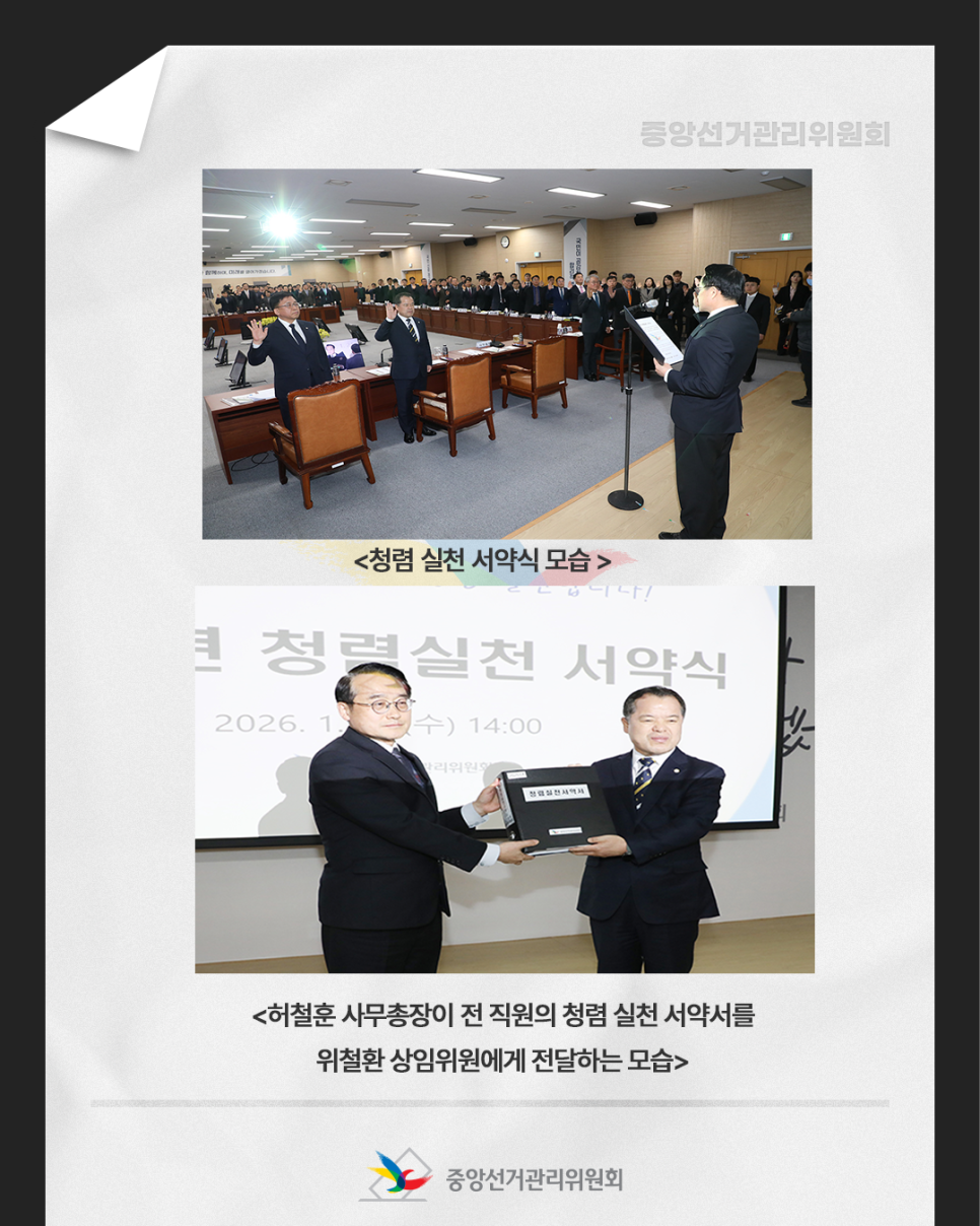 <청렴 실천 서약식 모습>과 <허철훈 사무총장이 전 직원의 청렴 실천 서약서를 위철환 상임위원에게 전달하는 모습>의 사진