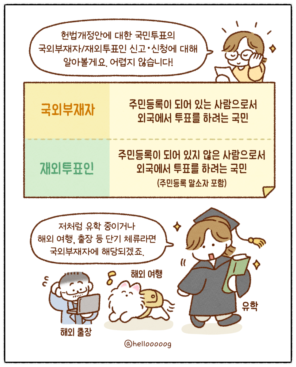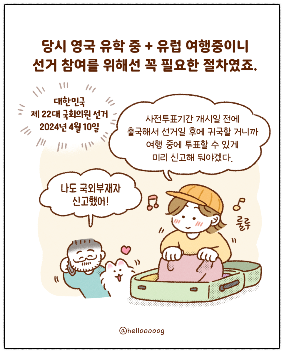 저처럼 유학 중이거나 해외 여행, 출장 등 단기 체류라면 국외부재자에 해당되겠죠.