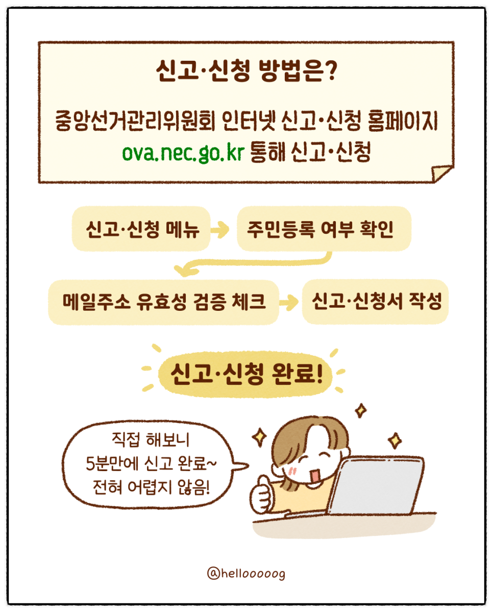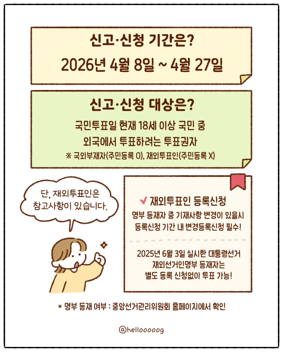 국외부재자/재외투표인 신고·신청을 기간 내에 마쳐야만 해요.