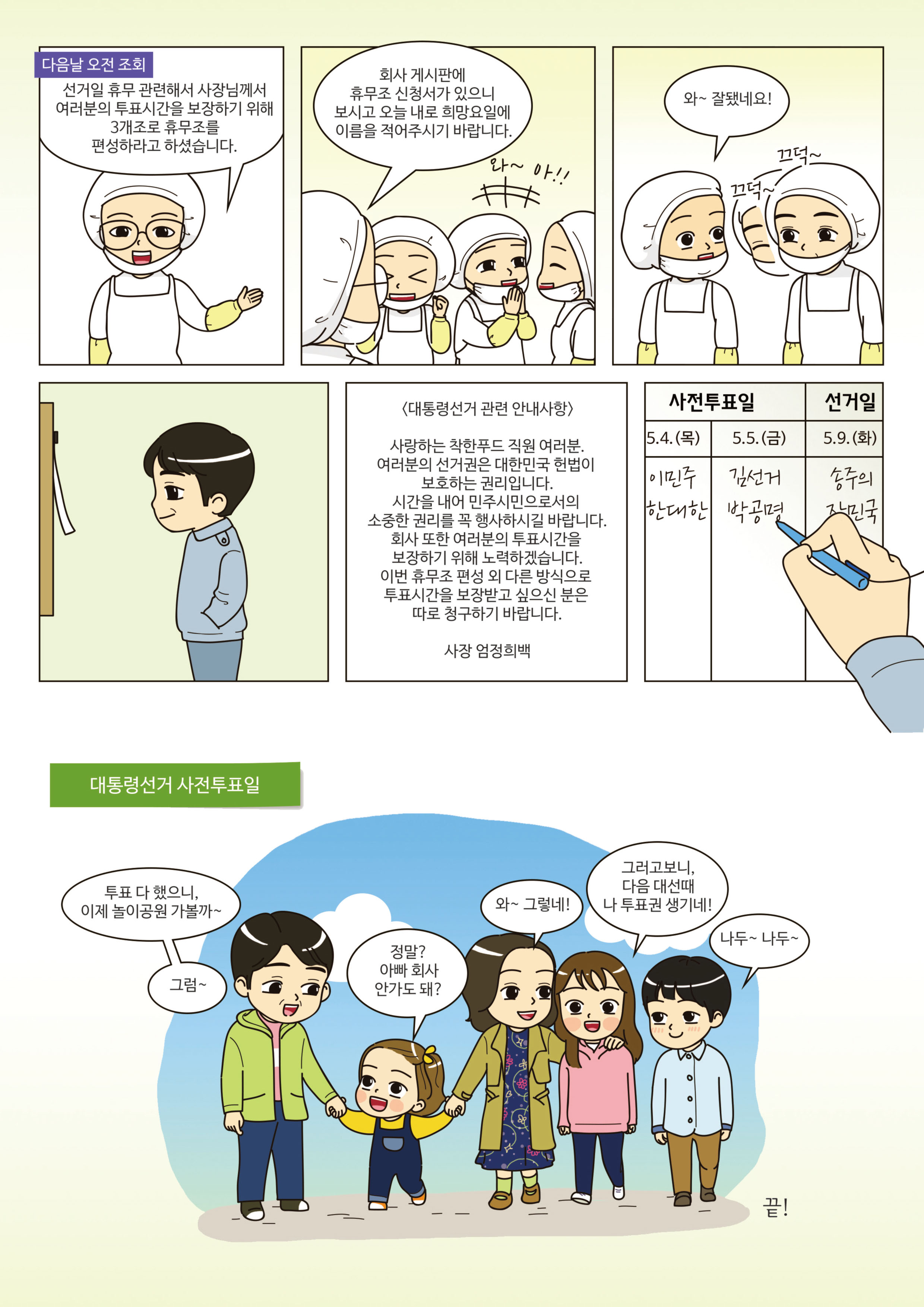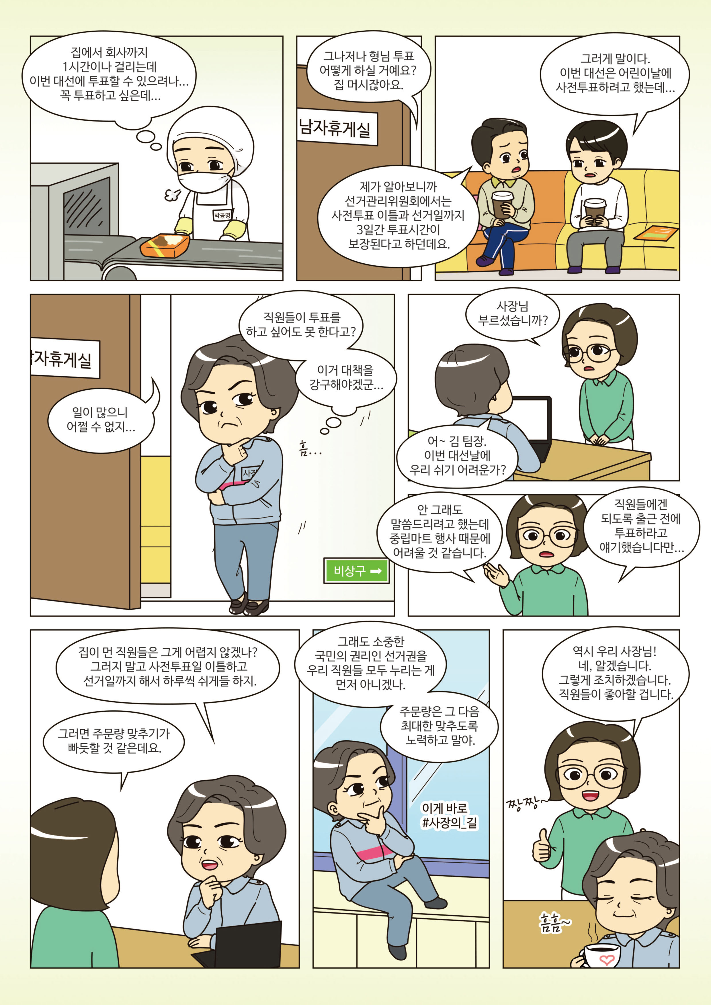 - 사장 : ‘직원들이 투표를 하고 싶어도 못 한다고? 이거 대책을 강구해야겠군.’