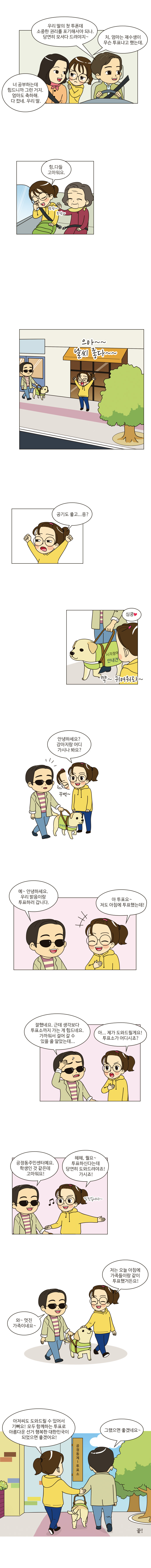 하늘을 보며 기지개를 켜다 민주는 검은색 선글라스를 낀 한 중년의 아저씨가 개 한 마리를 데리고 다가오는 것을 발견한다. 동물을 좋아하는 민주가 개에 가까이 다가서서 보니 ‘시각장애인 안내견’이라고 쓰인 노란색 조끼를 입고 있다.