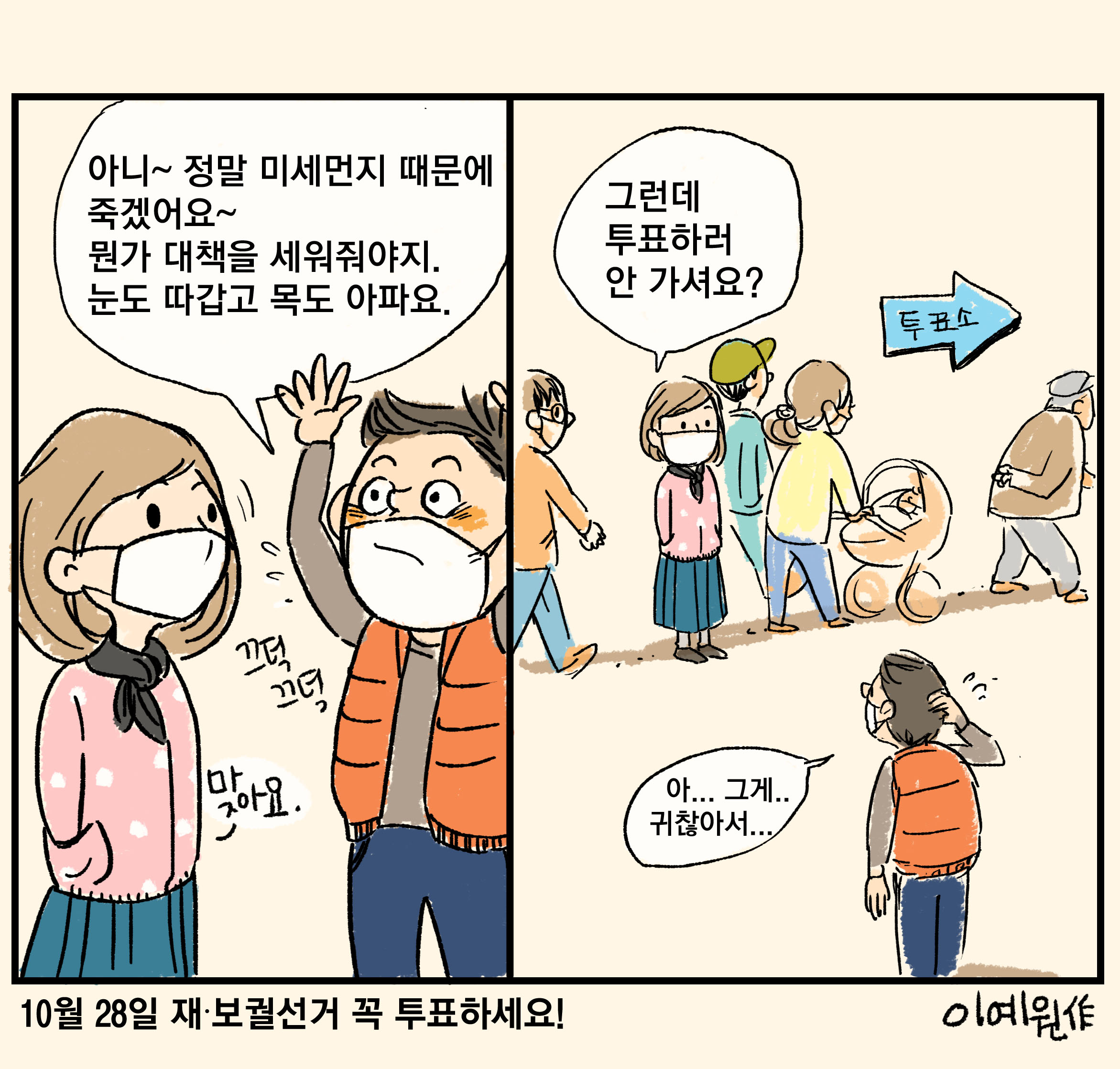 남자: 아니~ 정말 미세먼지 때문에 죽겠어요~