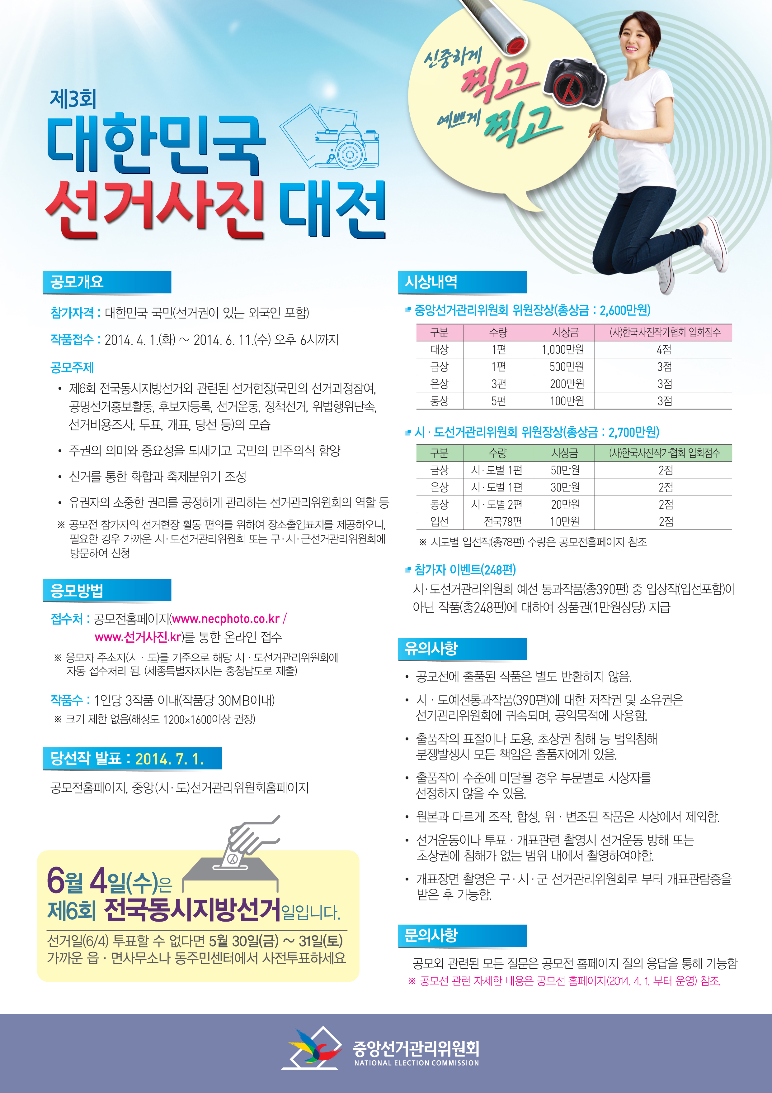 공모전홈페이지 : http://www.necphoto.co.kr/www.선거사진.kr.(2014. 4. 1.부터 운영) |