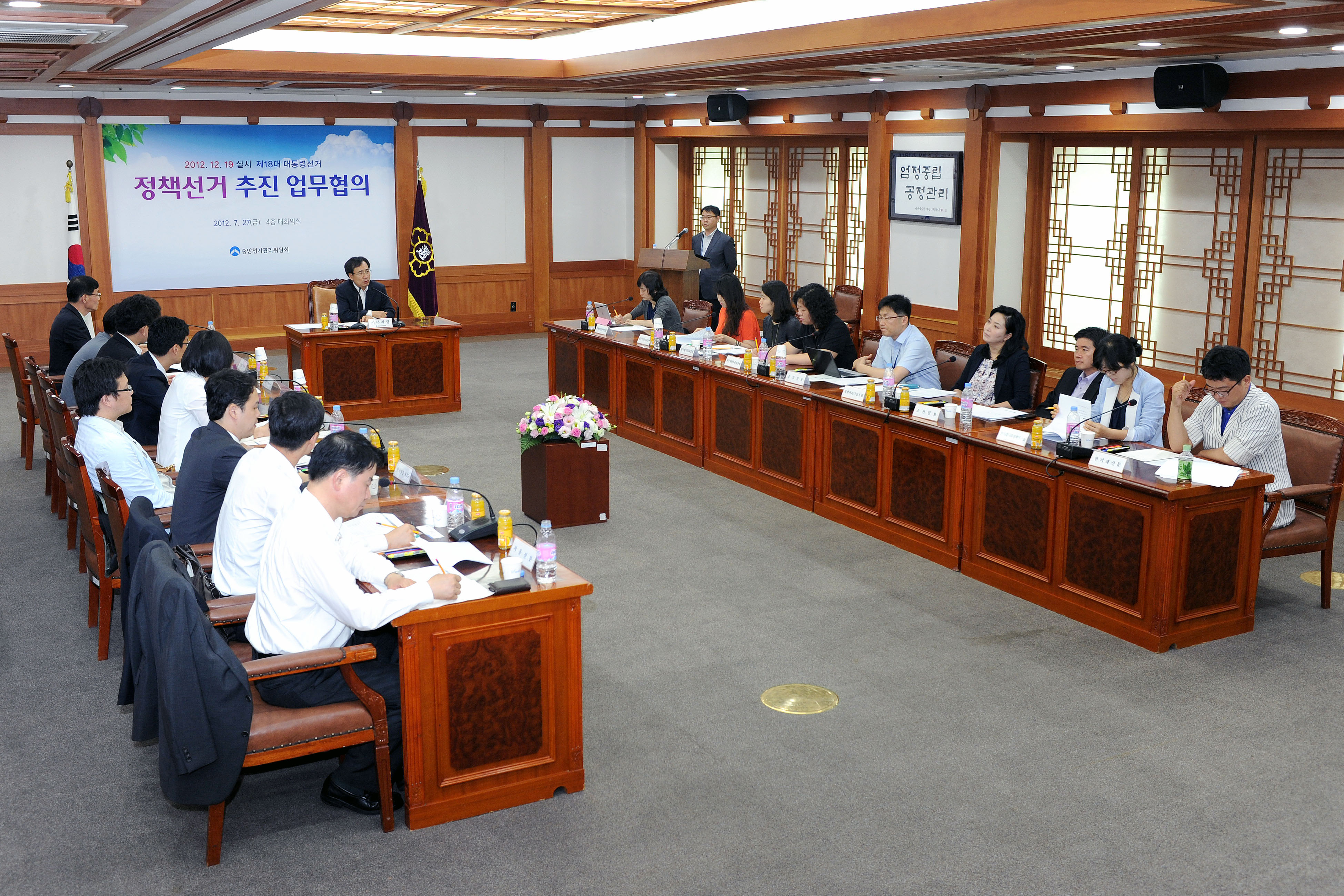 중앙선거관리위원회는 7. 27.(금) 오전 10시 30분 과천청사 대회의실에서 언론·학회·시민단체 관계자를 초청하여 오는 12월 19일 실시하는 제18대 대통령선거 정책선거추진 업무협의회를 개최하였다.