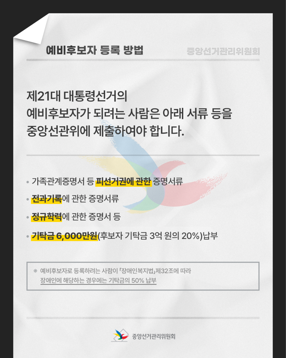 제21대 대통령선거의 예비후보자가 되려는 사람은 아래 서류 등을