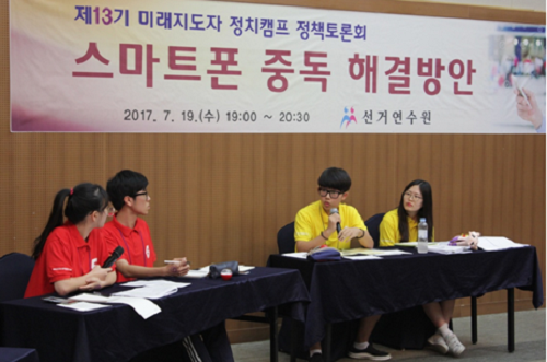 The students were split into five groups and came up with a variety of solutions including enforcing a mandatory installation of mobile use time widgets such as a ''mobile diet app,'' using public service advertisements to prevent smartphone addiction, holding smartphone use education programs for parents, introducing a smart phone addiction counseling center, conducting a culture day campaign, and opening an anti-addiction school.