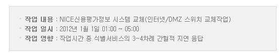 홈페이지 실명확인, 본인인증 등 식별서비스의 성능 개선 및 안정성 강화를 위한 시스템 교체작업으로 인해 아래와 같이 서비스의 간헐적 중단이 예상되오니 양지하시어 이용에 차질이 없으시길 바랍니다.