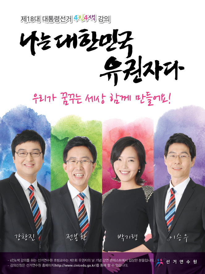 4인4색 강의는 선거연수원 홈페이지(http://www.civicedu.go.kr) 또는 전화(02-764-0213)를 통해 신청할 수 있다.