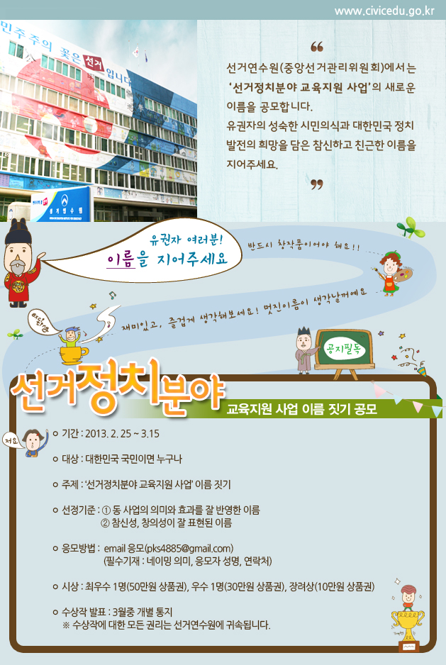 중앙선거관리위원회 선거연수원에서 선거정치분야 교육지원 사업 명칭을 공모하고 있습니다.