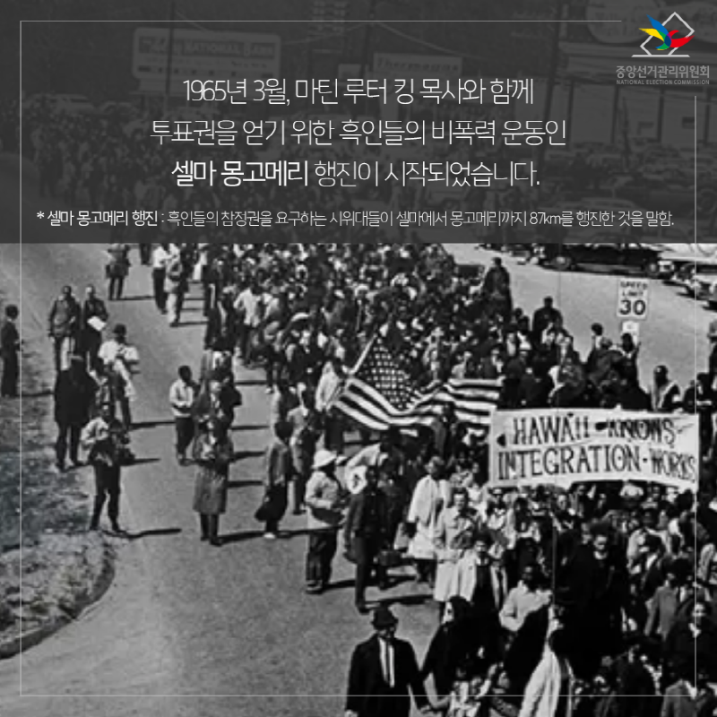 * 셀마 몽고메리 행진 : 흑인들의 참정권을 요구하는 시위대들이 셀마에서 몽고메리까지 87km를 행진한 것을 말함.