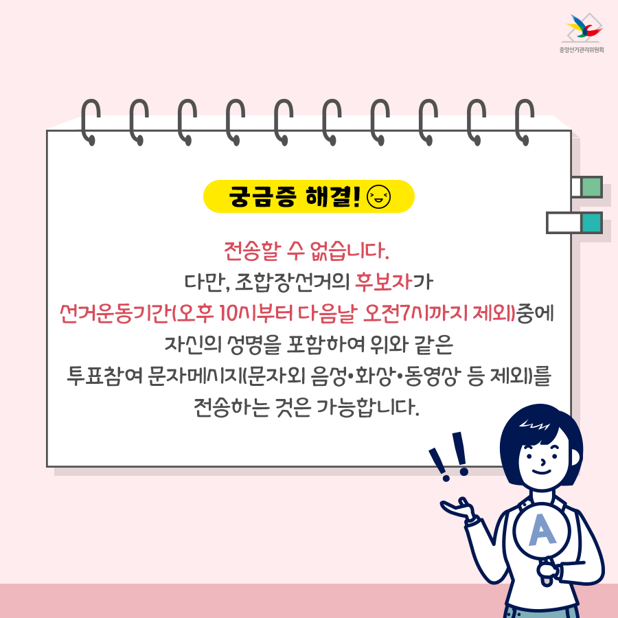 전송할 수 없습니다. 다만, 조합장선거의 후보자가 선거운동기간(오후 10시부터 다음날 오전 7시까지 제외)중에 자신의 성명을 포함하여 위와 같은 투표참여 문자메세지(문자외 음성·화상·동영상 등 제외)를 전송하는 것은 가능합니다.