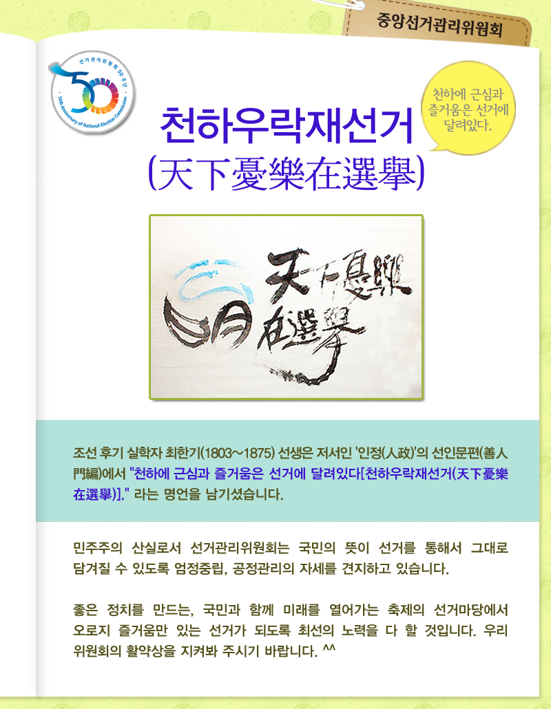 조선 후기 실학자 최한기(1803~1875) 선생은 저서인 '인정(人政)'의 선인문편(善人門編)에서 "천하에 근심과 즐거움은 선거에 달려있다[천하우락재선거(天下憂樂在選擧)]." 라는 명언을 남기셨습니다.