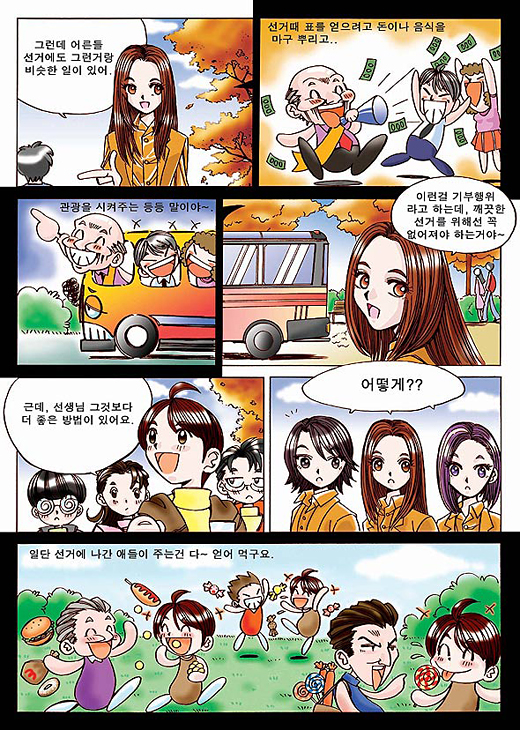 선거때 표를 얻으려고 돈이나 음식을 마구 뿌리고 관광을 시켜주는 등등 말이야~
