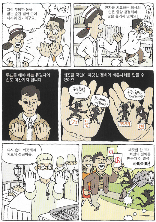 의사 손이 깨끗해야 치료에 성공하듯, 개끗한 한 표가 희망의 정치를 만든다 이 말씀. 사라져라!