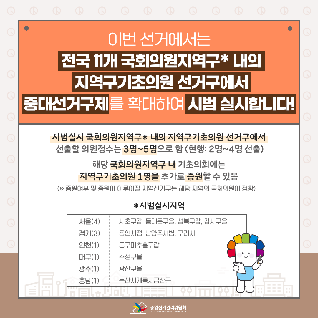 이번 선거에서는 전국 11개 국회의원지역구* 내의 지역구기초의원 선거구에서 중대선거구제를 확대하여 시범 실시합니다!