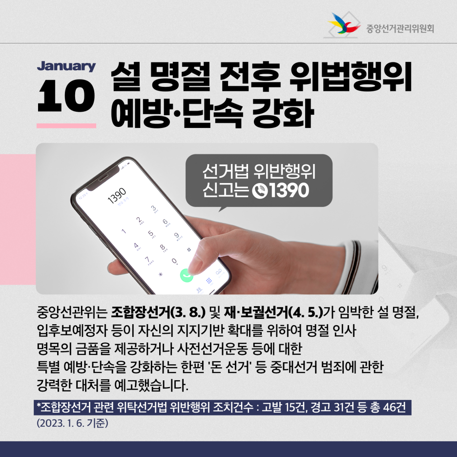 중앙선관위는 조합장선거(3. 8.) 및 재·보궐선거(4. 5.)가 임박한 설 명절, 입후보예정자 등이 자신의 지지기반 확대를 위하여 명절