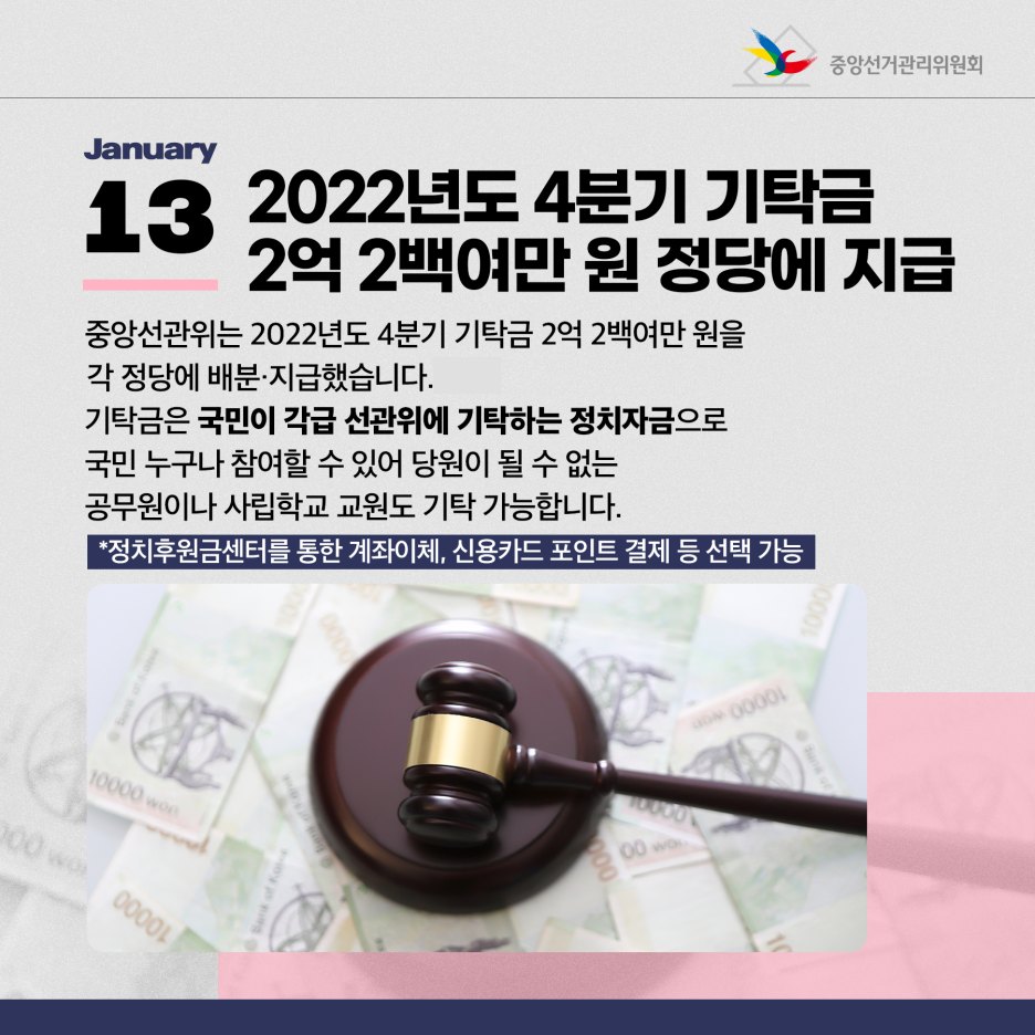 중앙선관위는 2022년도 4분기 기탁금 2억 2백여만 원을 각 정당에 배분·지급했습니다.