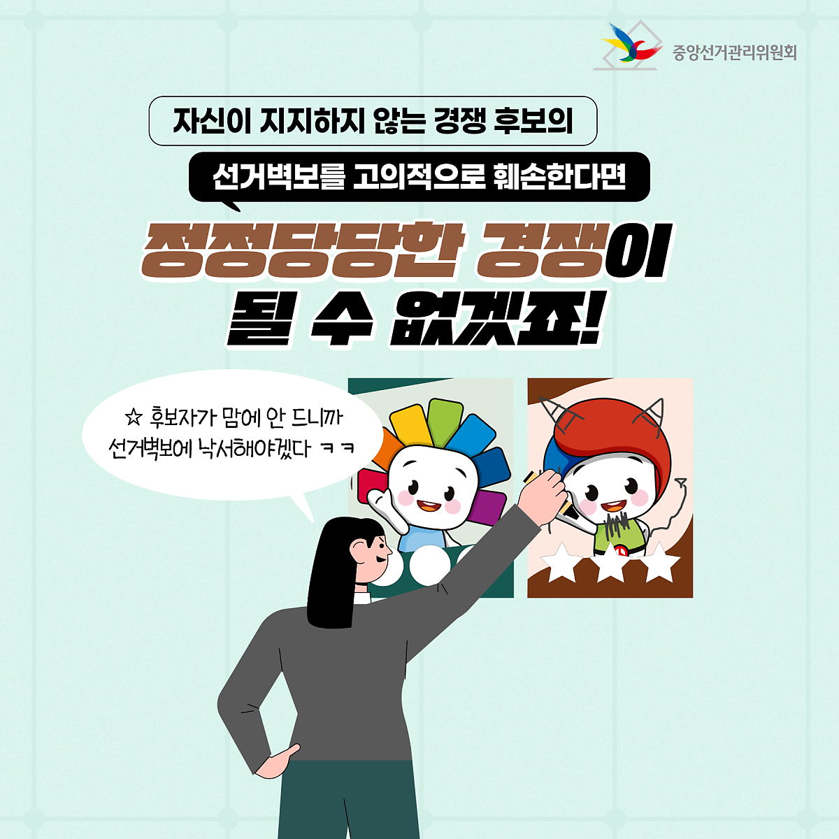 자신이 지지하지 않는 경쟁 후보의 선거벽보를 고의적으로 훼손한다면 정정당당한 경쟁이 될 수 없겠죠!