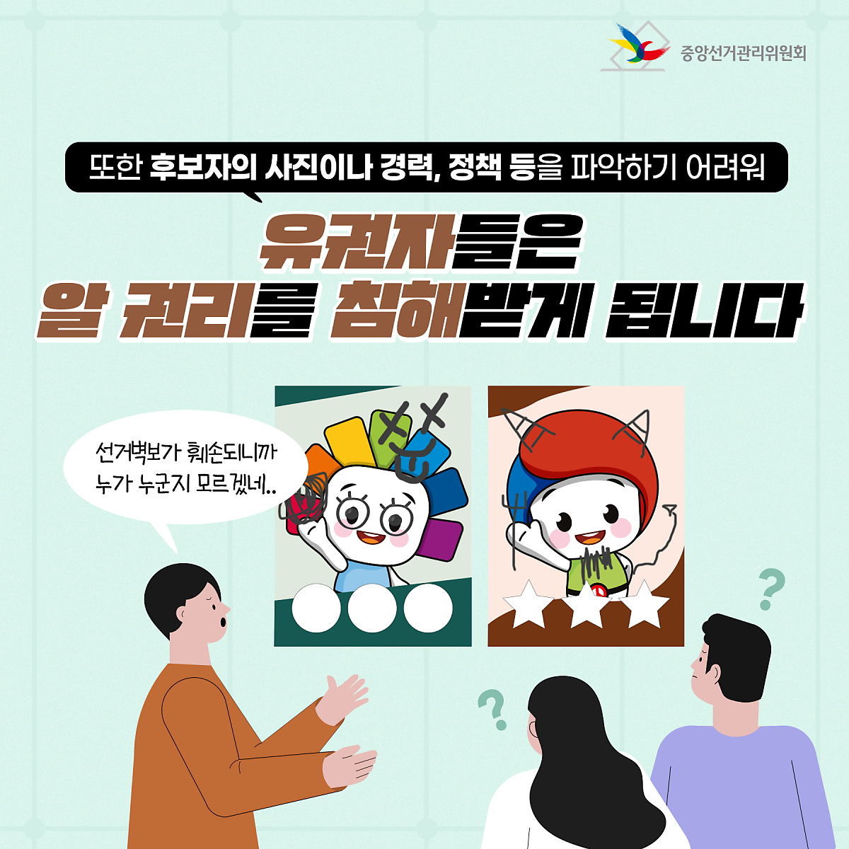 또한 후보자의 사진이나 경력, 정책 등을 파악하기 어려워 유권자들은 알 권리를 침해받게 됩니다.