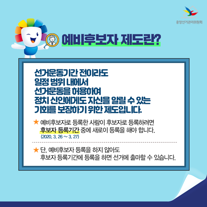 * 단, 예비후보자 등록을 하지 않아도 후보자 등록기간에 등록을 하게 되면 선거에 출마할 수 있답니다.