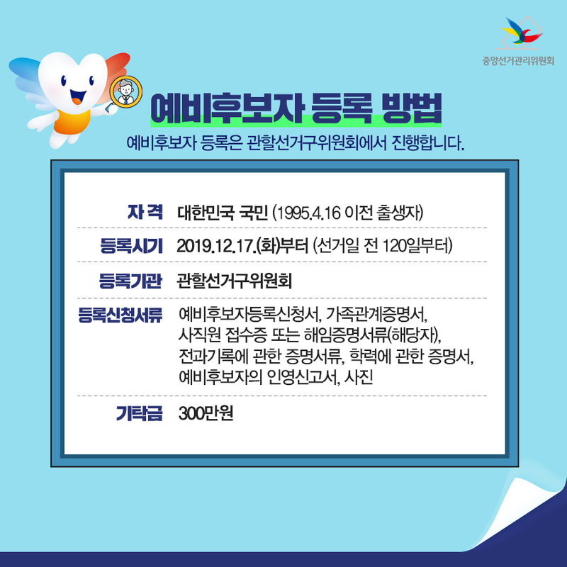 - 등록시기: 2019.12.17.(화)부터 (선거일 전 120일부터)