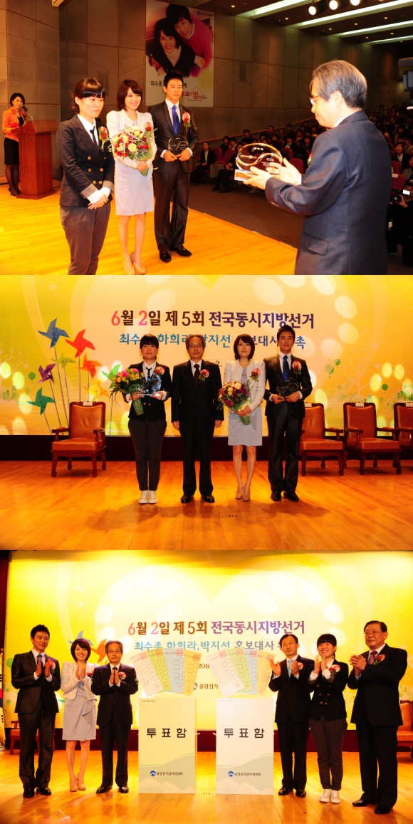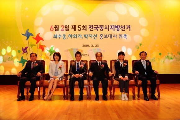 중앙선거관리위원회는 탤런트 최수종ㆍ하희라 부부와 개그우먼 박지선씨를 공명선거 홍보대사로 위촉하고, 2월 25일(목) 오후 1시 30분 중앙선관위 청사에서 위촉식을 열었다.