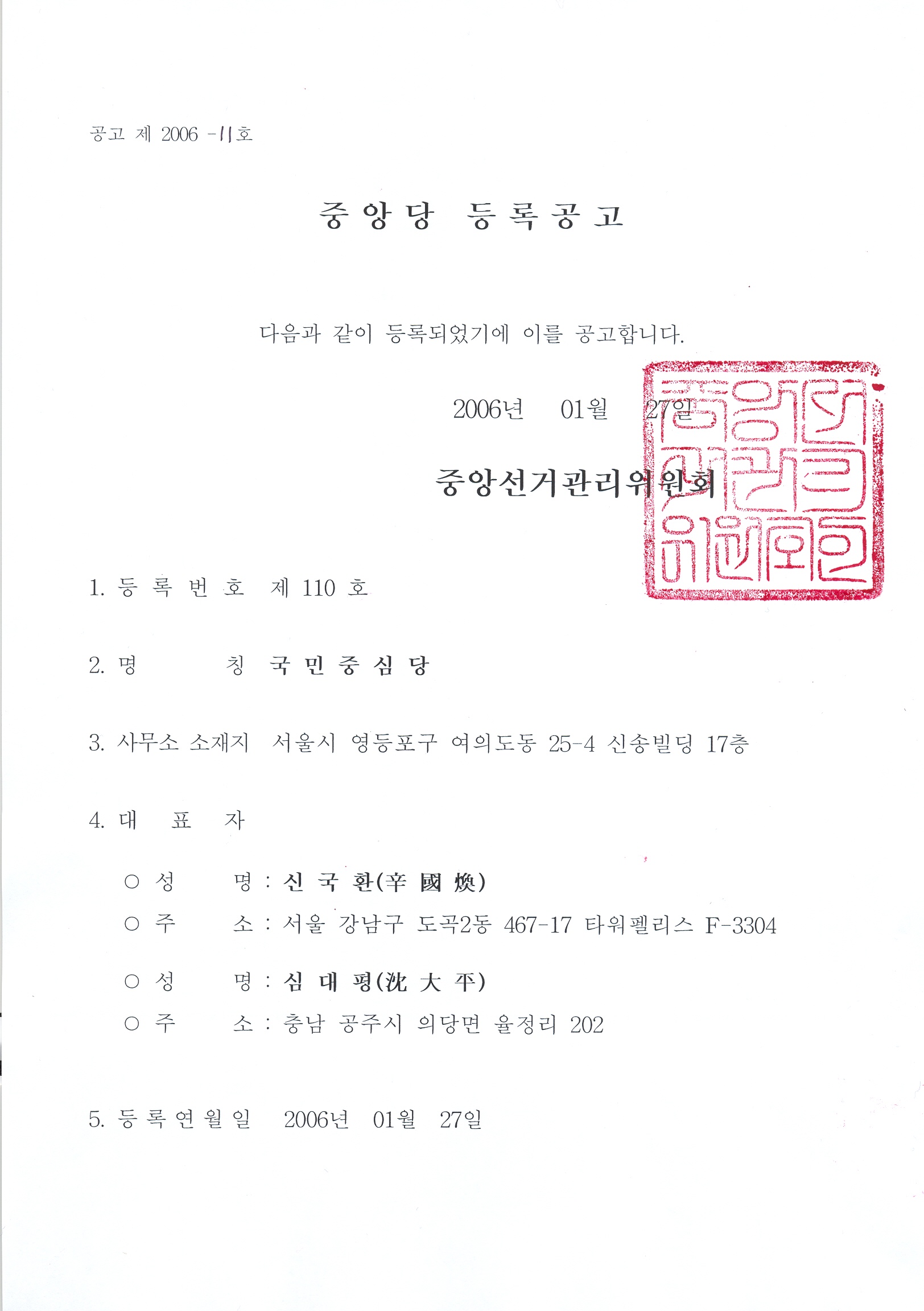 국민중심당이 등록되었기에 [첨부파일]과 같이 이를 공고합니다. - 정당과 -
