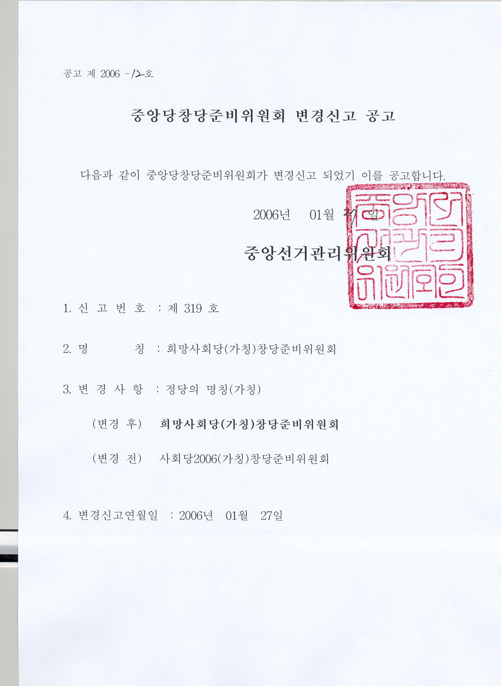 첨부파일과 같이 중앙당창당준비위원회의 명칭이 변경신고 되었기에 이를 공고합니다. - 정당과 -